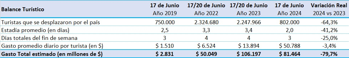 lLos turistas gastaron en promedio $50.788 diarios, 3,4% menos que en la misma fecha de 2023 (a precios reales) y tuvo una estadía media de 2 días, que también resultó por debajo de lo que es habitual en un fin de semana de 3 días (suele ser entre 2,2 y 2,5).